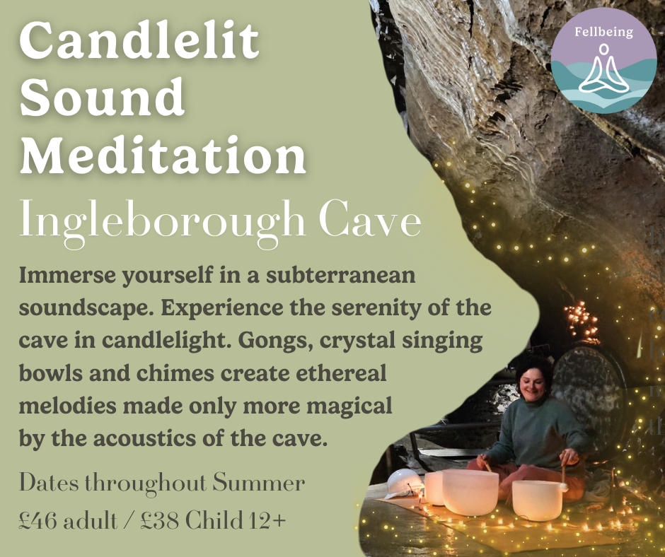We meet outside The Old Sawmill Cafe, Clapham. This is the start of the scenic 1.3 mile undulating gravel nature trail that leads to the cave entrance. The walk will take approximately 40 minutes and Lauren will provide prompts and invitations to soak up the beauty of the natural surroundings. The Cave journeys 0.3 miles (0.5km) underground, so we will walk a total of 0.6 miles (1km). There are two short stooping sections within the Cave, and there are no steps. The passages are well lit with floodlights throughout, which illuminates the calcite flows, stalactites and stalagmites. It takes about 5 minutes to walk to the part of the cave where the sound meditation takes place. The sound meditation will last approximately 50 minutes. Following the event you can explore the surrounding footpaths or return via the trail. The event time takes in to consideration the walk back to the start of the trail (approximately 30 mins).