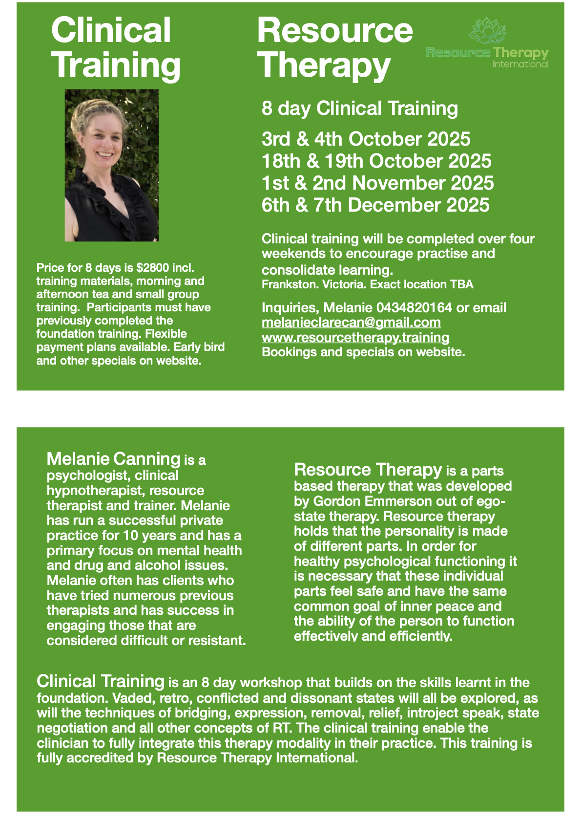 Following on the Foundation Training the Clinical training will explore the eight pathologies that states can have in depth including diagnosis and treatment strategies for each pathology. It is an 8 day workshop that builds on the skills learnt in the foundation. Vaded, retro, conflicted and dissonant states will all be explored, as will the techniques of bridging, expression, removal, relief, introject speak, state negotiation and all other concepts of RT. The clinical training enable the clinician to fully integrate this therapy modality in their practice. This training is fully accredited by Resource Therapy International