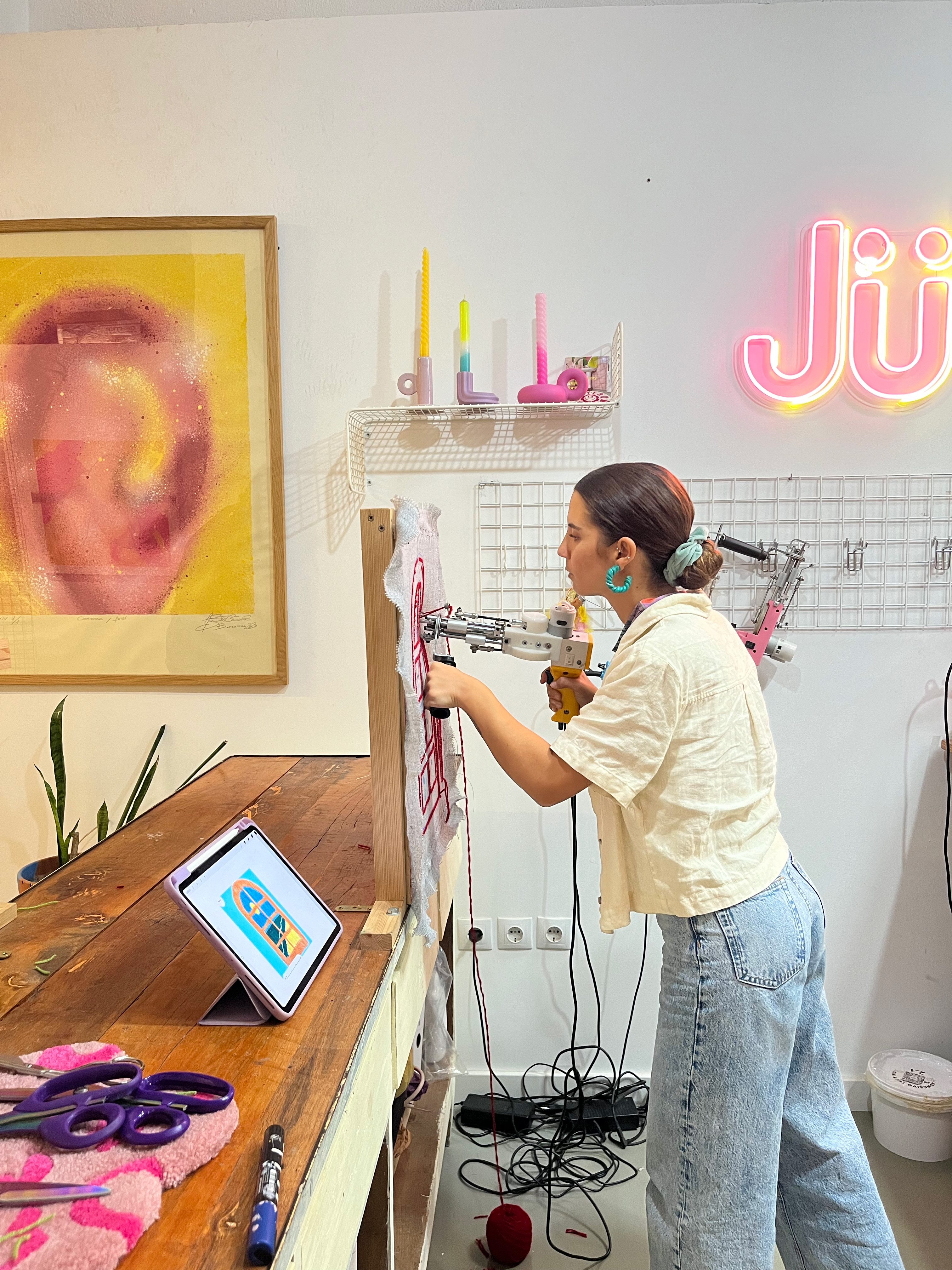Haz tu propia pieza de tufting en un ambiente especial: Todo el material incl. , ☕️ + 🥐 /🍰 y un descuento extra de -20% en nuestro estudio de Arte, situado al lado del local.