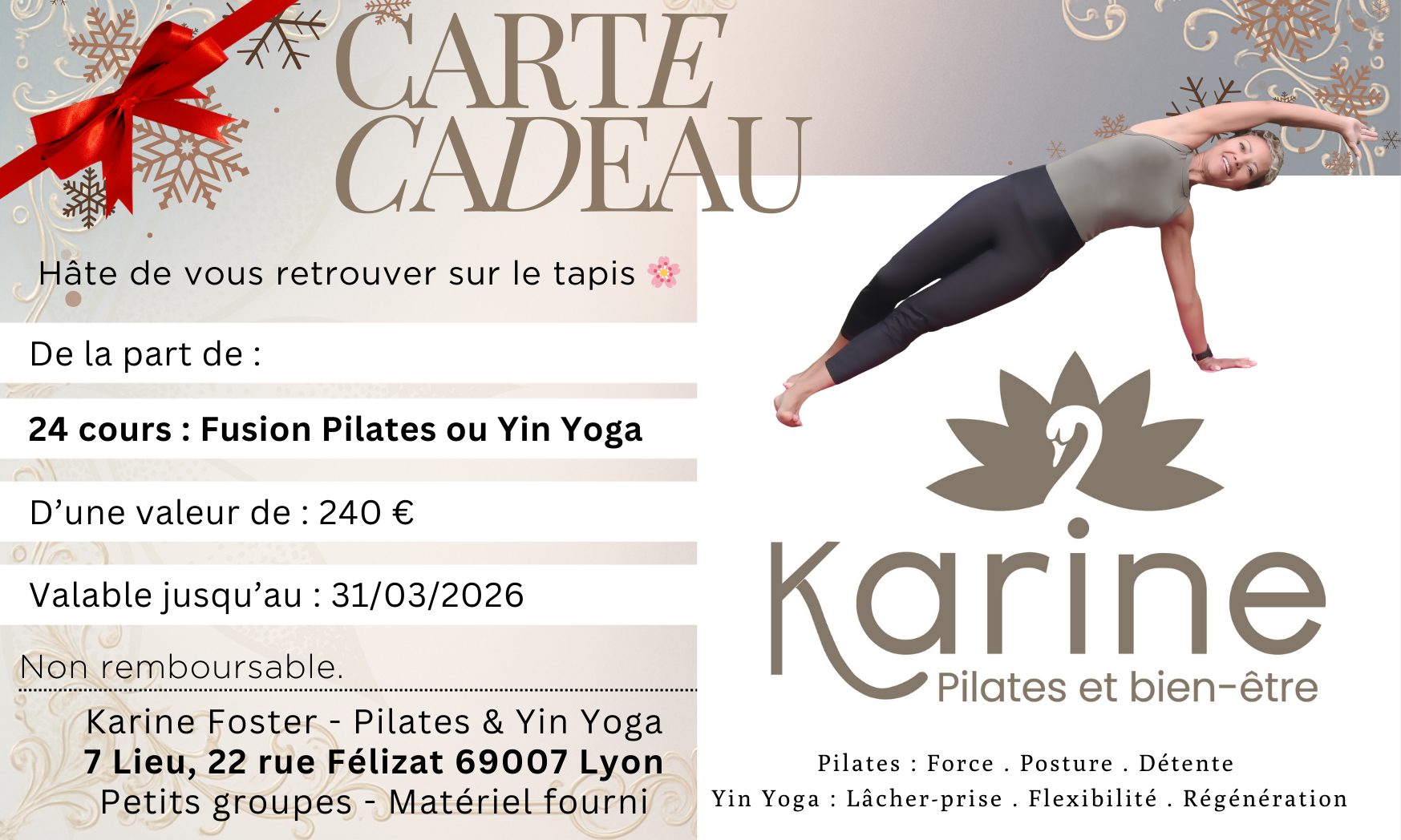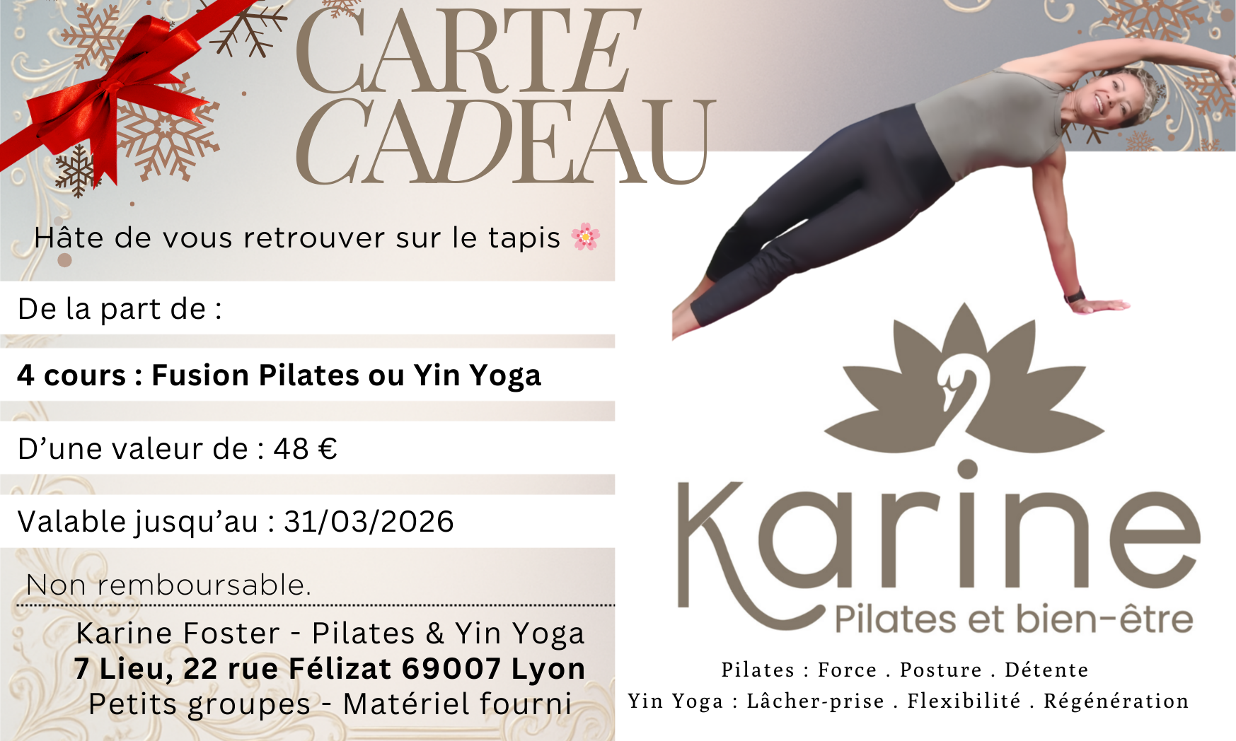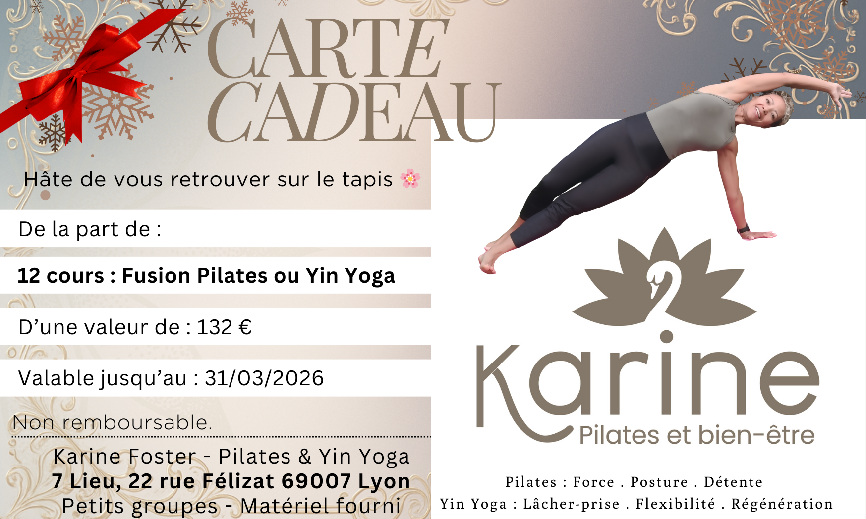 Cette carte donne accès à 4 cours au choix auprès de Karine Foster – Pilates & Yin Yoga.