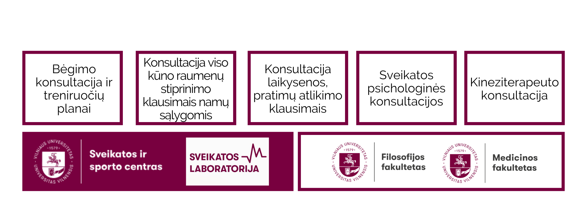 ,,Sveikatos laboratorija" įsikūrusi Saulėtekyje (VU Sveikatos ir sporto centre bei VU Bendruomenės gerovės centre), kurioje vyksta atviros ir nemokamos individualios sveikatos stiprinimo konsultacijos (gyvai arba nuotoliniu būdu) VU bendruomenės nariams.