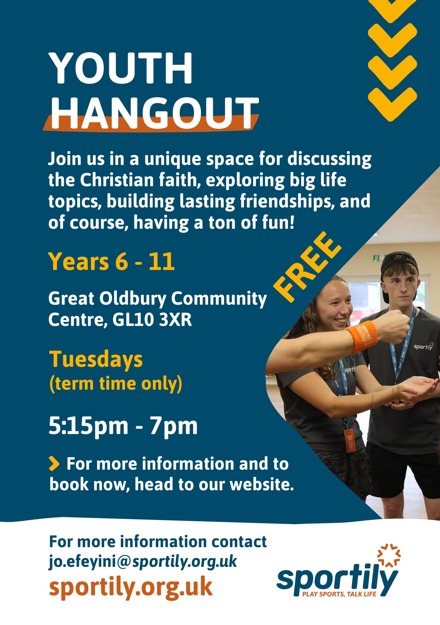 Welcome to the Sportily Youth Hangout – a unique space for discussing the Christian faith, exploring big life topics, building lasting friendships, and of course, having a ton of fun! It's more than just a leadership program; it's a journey of growth, connection, and shared experiences, whilst also enjoying hot food and drinks. Sessions free. Join us fortnightly and let the adventure begin! 🌟🗣️🤝🎉