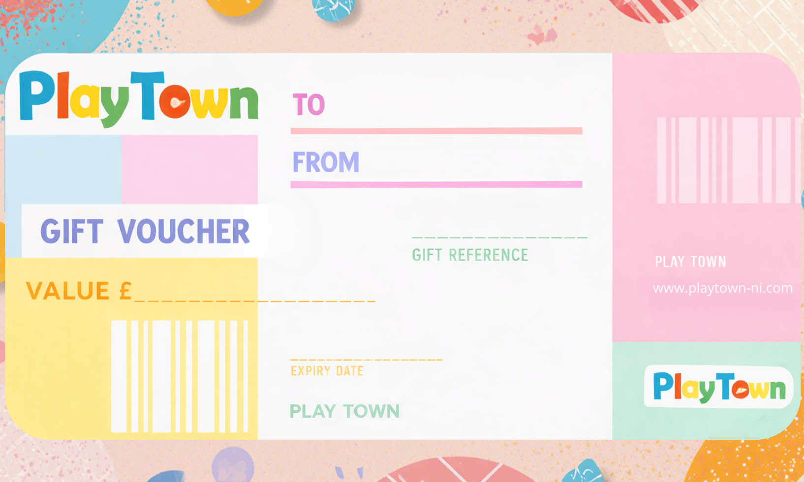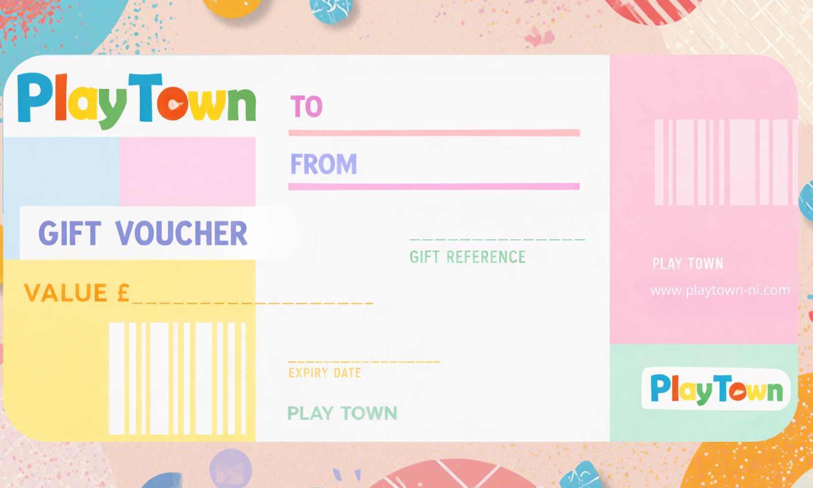 Give the gift of a play session at Play Town. Valid for one year from purchase. Includes one adult