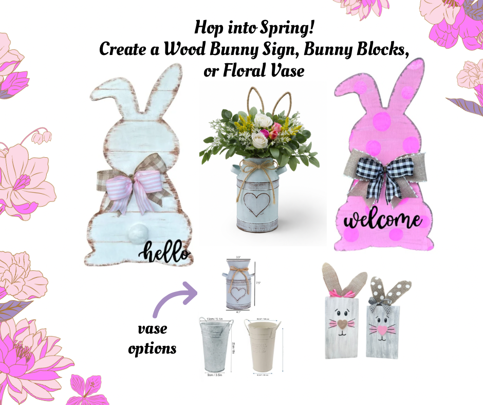 Join us for a hands-on workshop where you'll craft your own charming wood bunny sign, blocks, or faux floral vase - perfect for adding a touch of seasonal charm to your home.