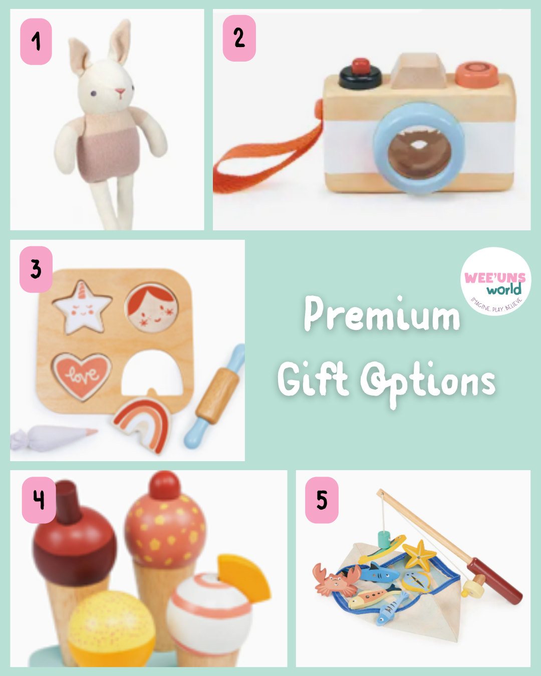 You can upgrade your gift to a wooden toy or plush by ThreadBear for £10. Select your choice from the options include (1-5) and we will have it wrapped and ready to come from Sant.